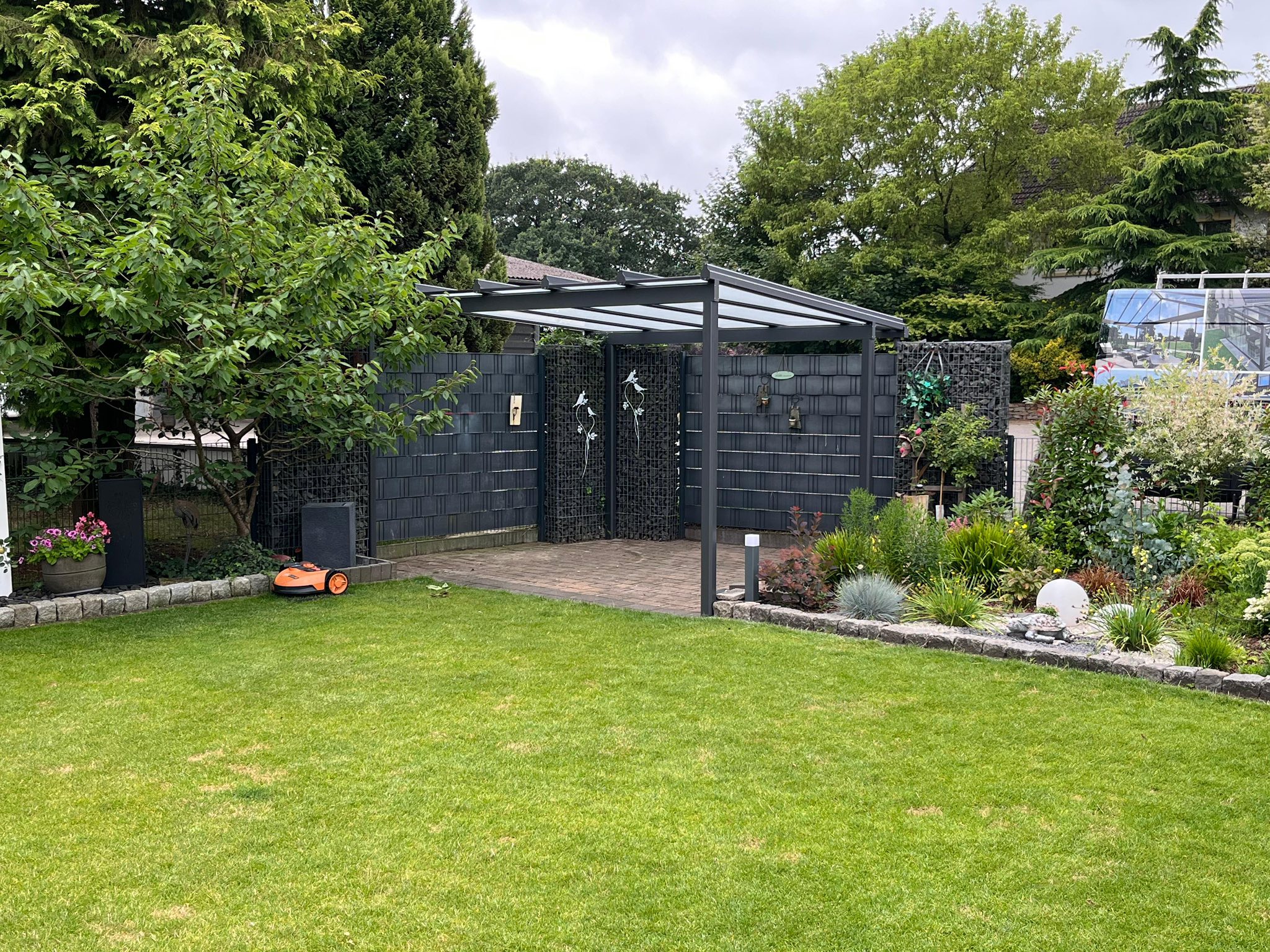 Freistehendes Terrassendach in Trapezform mit Milchglas