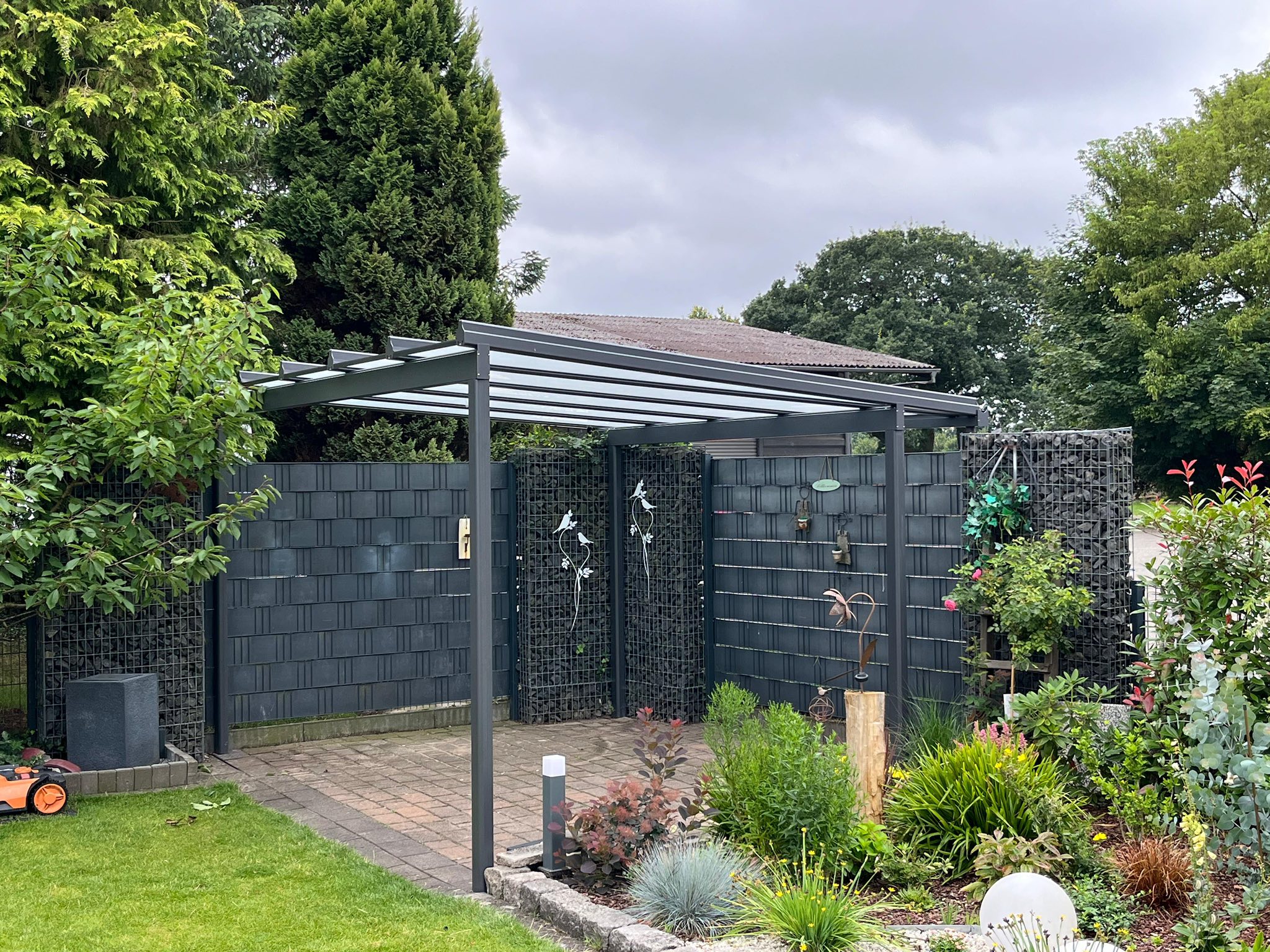 Das Projekt umfasst ein freistehendes Terrassendach in Trapezform, zweiseitig abgeschrägt und mit Milchglas eingedeckt. Die Konstruktion bietet einen geschützten Bereich im Freien und sorgt für eine helle, gleichmäßige Lichtverteilung